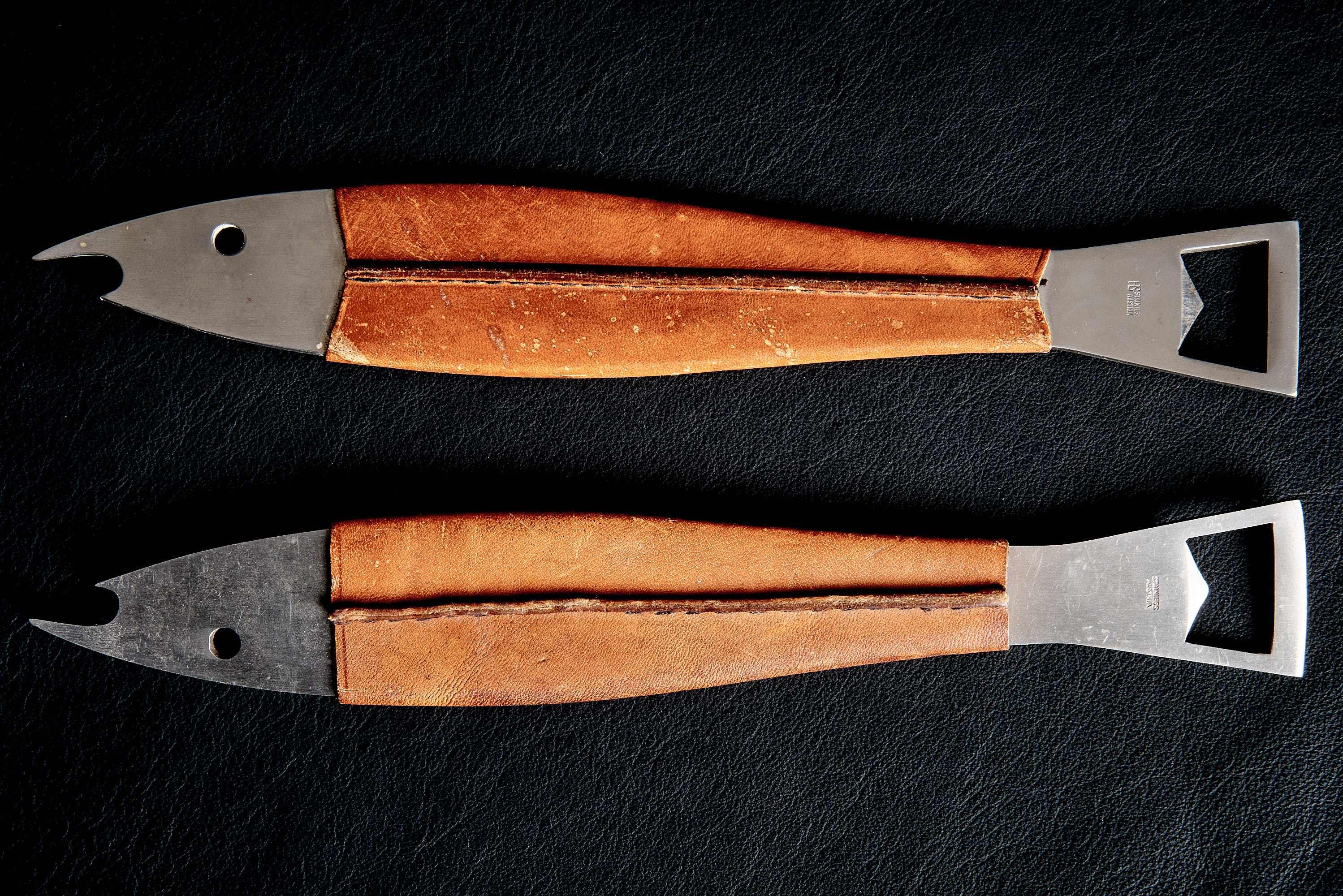 Pair of stainless-steel bottle openers with tan leather-wrapped handles fish-head cap lifter on one end and a rectangular opener cut-out on the other. Marked “STAINLESS AUSTRIA.” Light wear to metal and leather.