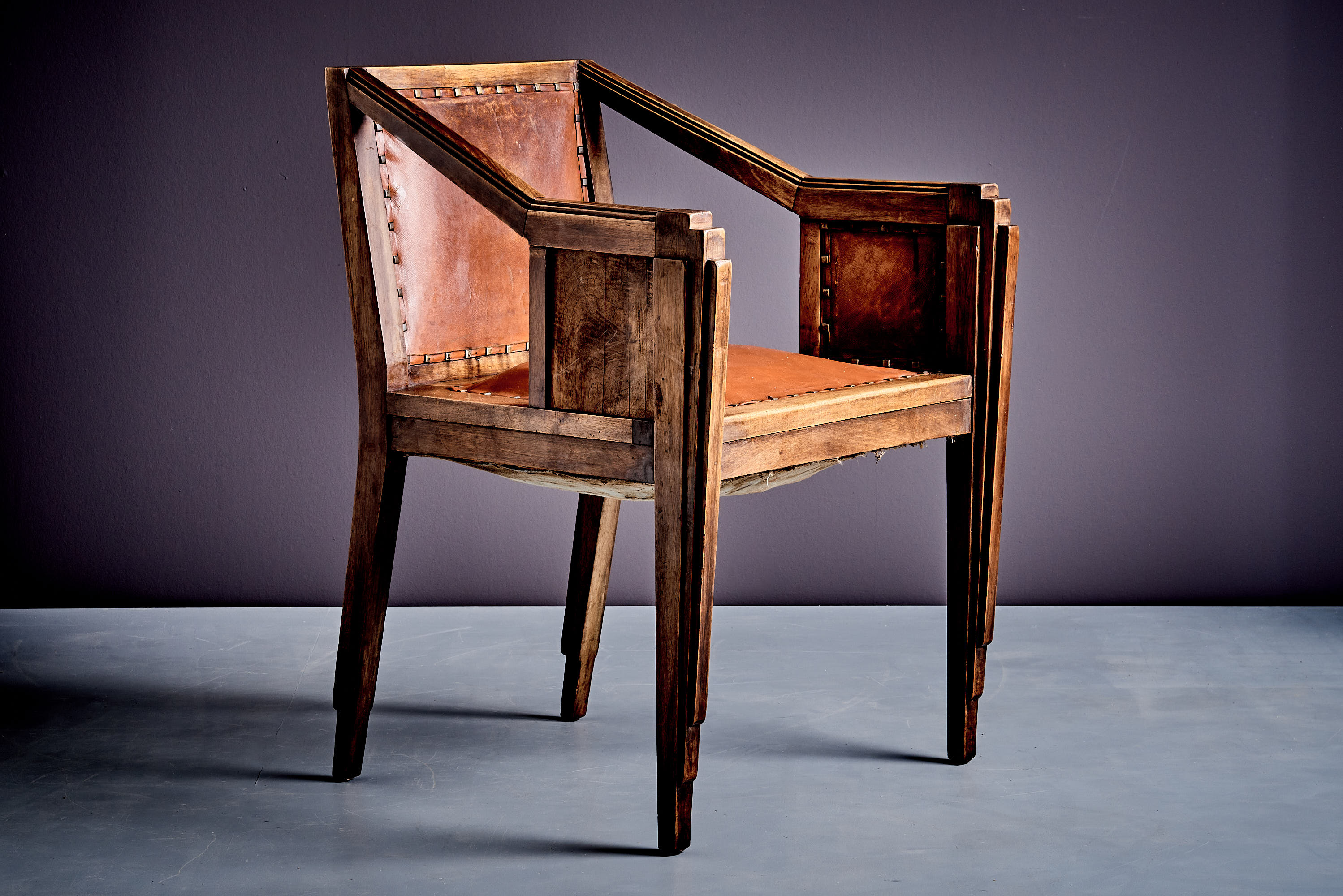 A striking early Art Deco armchair distinguished by its sharply faceted geometry and stepped side profiles. Constructed in solid wood with original patinated leather panels, the chair reveals meticulous hand-crafted joinery and square nail detailing. Its angular silhouette, slanted arms, and architectural volume reflect the transition from traditional craftsmanship to the modernist vocabulary emerging in France during the 1920s. A rare surviving example retaining authentic wear and character. This chair shows wear on the upholstery. We recommend having it reupholstered in our in-house workshop with a fabric or leather of your choice.