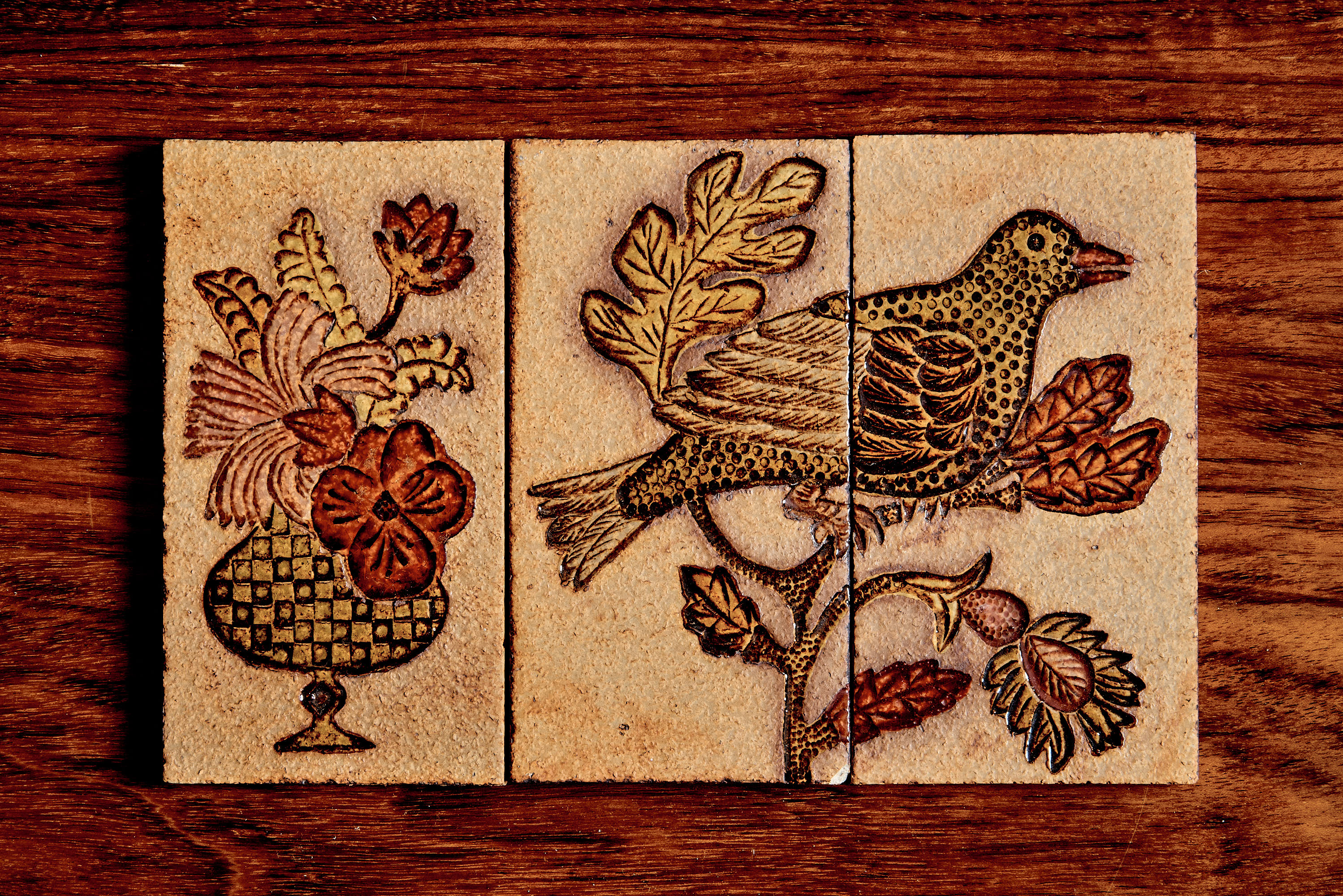 This set of three ceramic tiles forms a continuous decorative composition depicting a stylized bird among branches and foliage, accompanied by a floral motif in a chalice. Executed in incised line and dotted relief, the imagery is enriched by warm, earthy glazes characteristic of Vallauris ceramics. Each tile measures 8 × 15 cm.