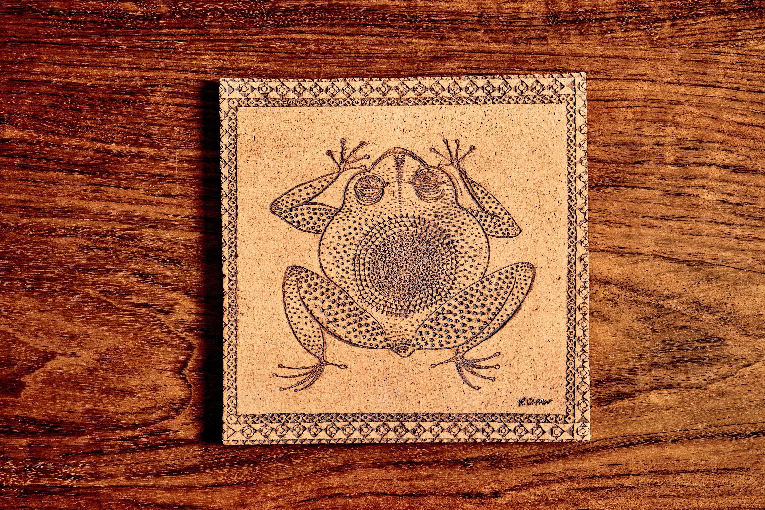 This square ceramic tile depicts a stylized frog rendered in incised line and dotted relief, framed by a geometric border. The textured surface is characteristic of Vallauris ceramics. The piece is in good vintage condition and is signed with Capron.
