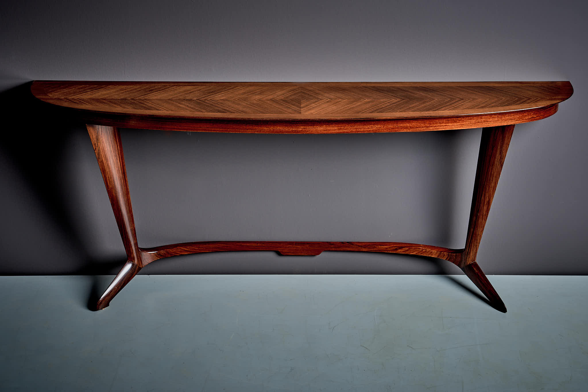 Console table in richly figured rosewood, with a long demi-lune top raised on two tapering supports joined by a shaped stretcher. The top is composed as a framed parquetry field, its chevron and diamond-matched veneers emphasizing the length of the piece while giving the surface a precise, almost architectural order. Recently restored; the piece is presented in excellent condition.