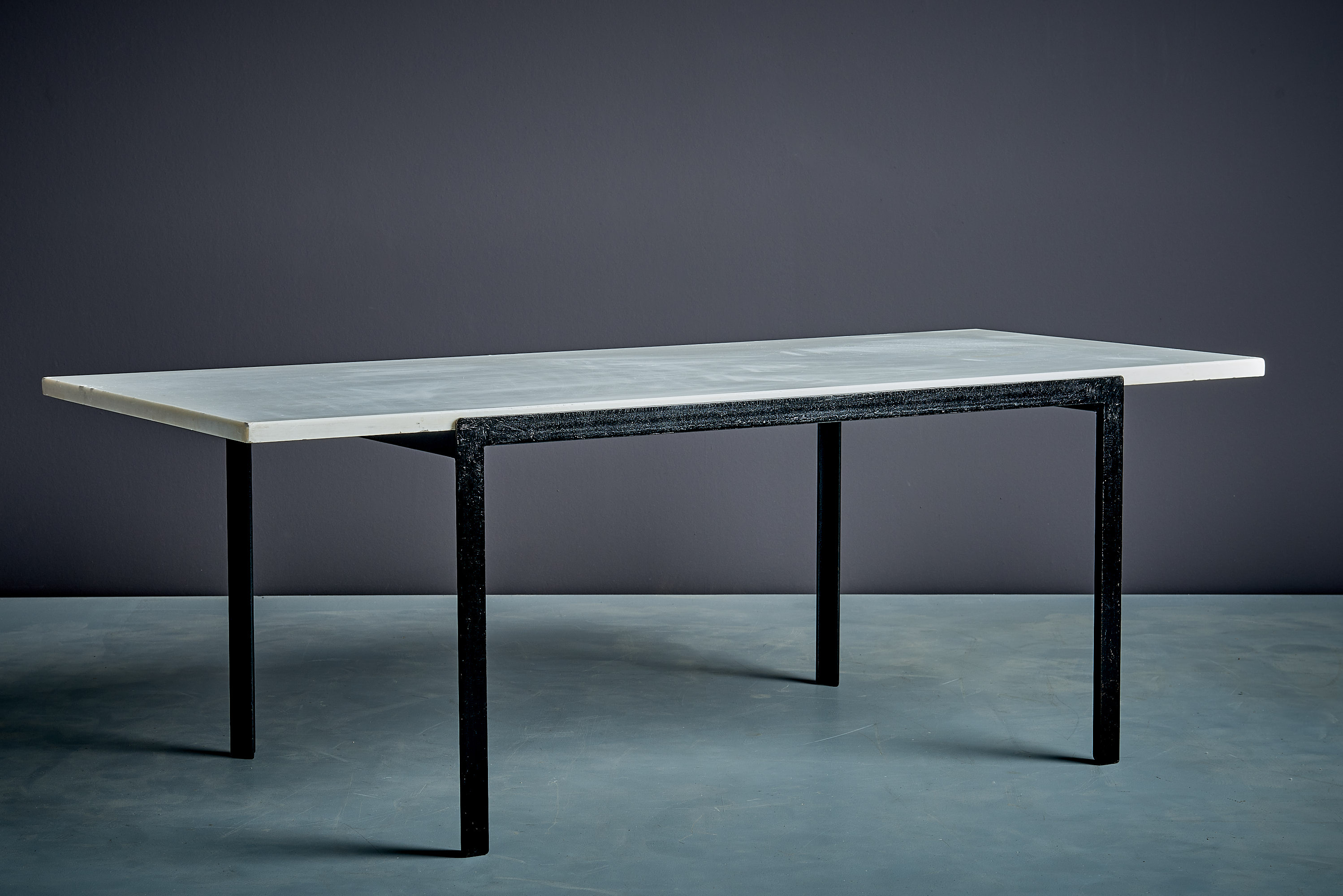 Florence Knoll T-Angle coffee table with marble top, Knoll International. Black enameled steel base with the signature architectural “T” profile, paired with a white marble slab. Original piece with attractive patina ; scratches and small chips consistent with age and use. A timeless modernist table that fits effortlessly into contemporary, minimalist, or eclectic interiors.