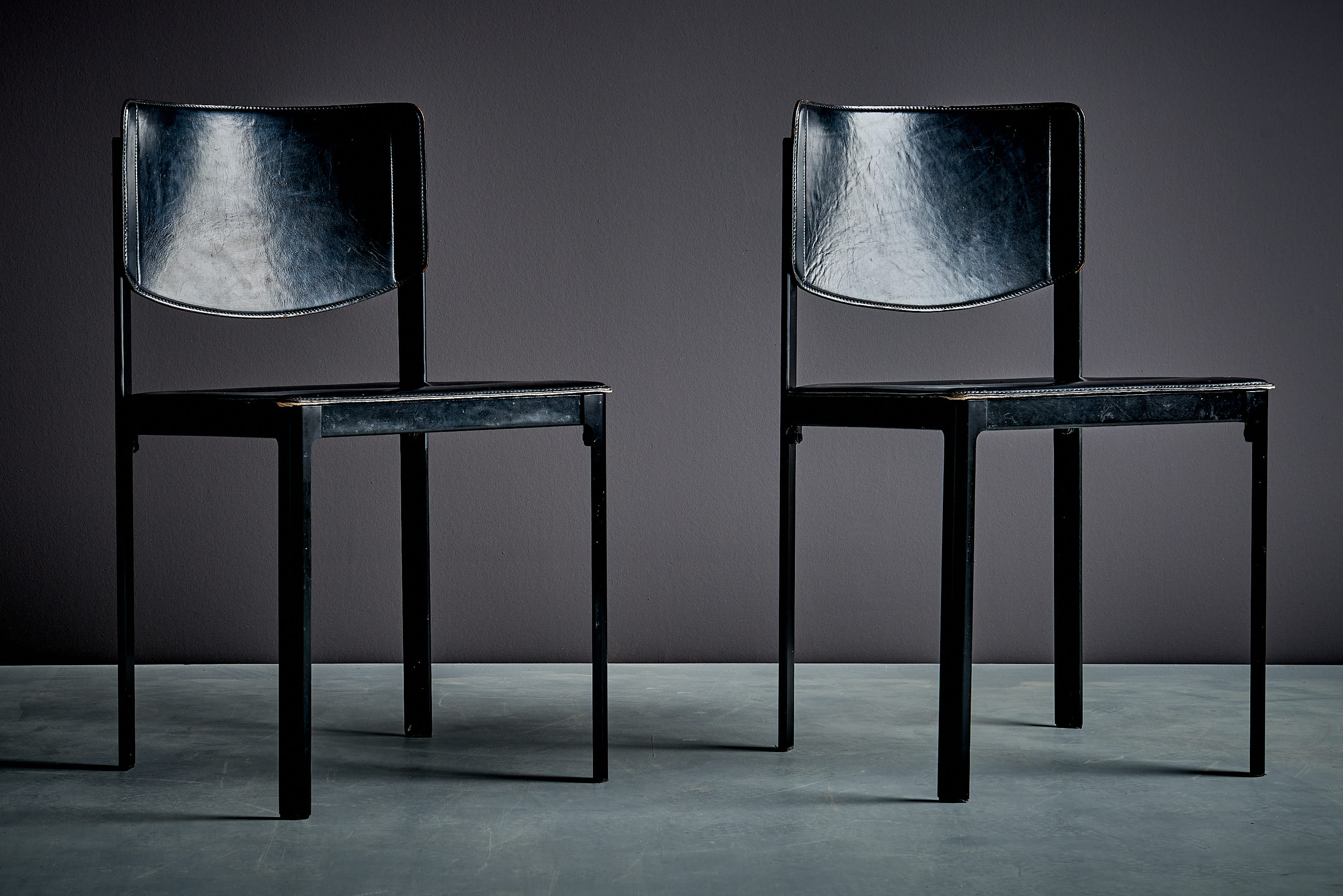 A refined pair of chairs defined by clean lines, a lightly curved backrest, and a restrained, architectural silhouette. Fully wrapped in hand-stitched black saddle leather, they reflect Matteo Grassi’s precise craftsmanship and material-driven approach.