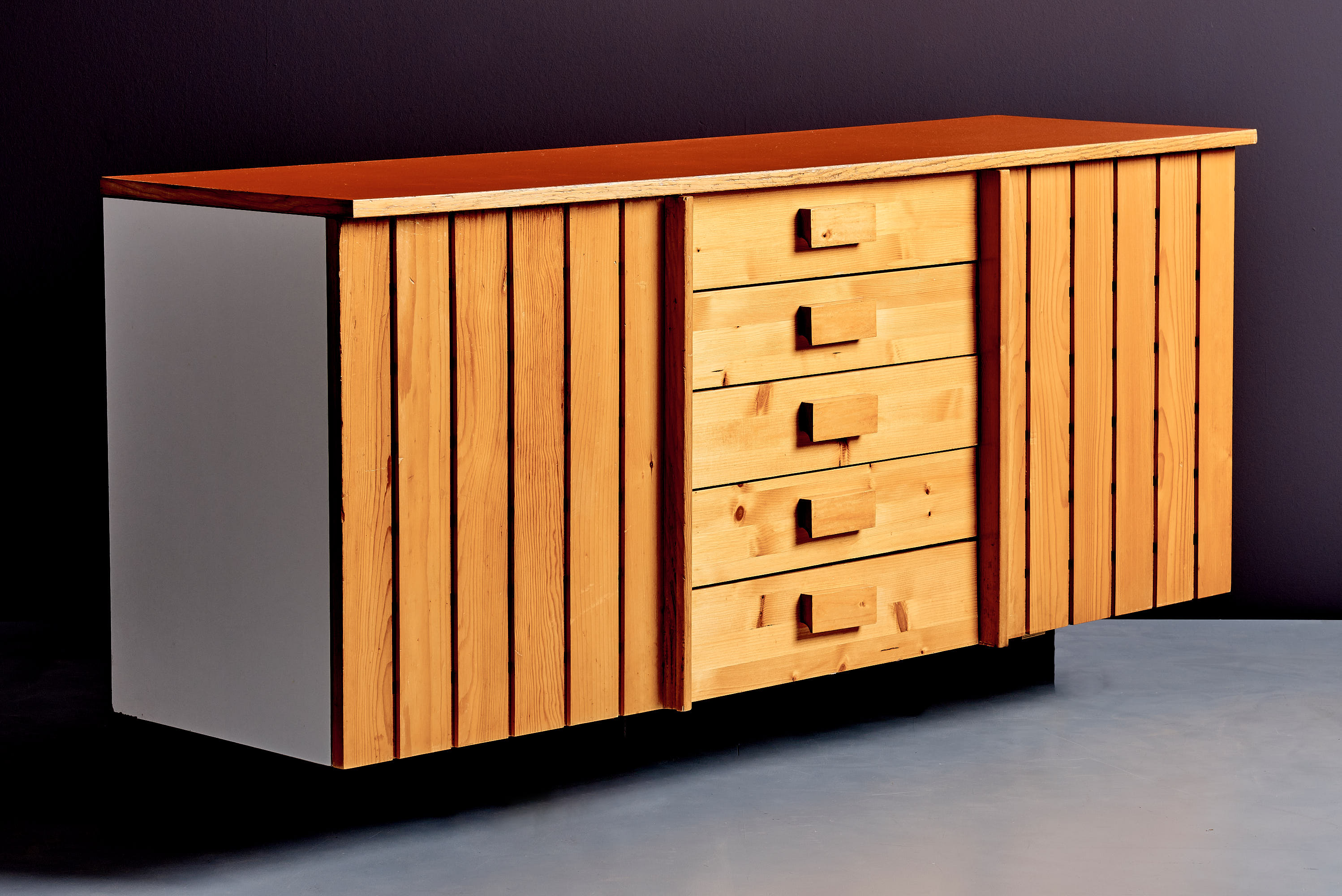 An original interior sideboard from the Les Arcs Ski Resort, designed for the La Cascade complex in the 1970s by Charlotte Perriand. Executed in pine, the piece exemplifies Perriand’s alpine modernism through its modular construction, vertical slatted fronts, and integrated drawers. Originally conceived for wall mounting and collective mountain living, it is preserved in good vintage condition with its original patina, retaining the material honesty and architectural clarity characteristic of the Les Arcs interiors.