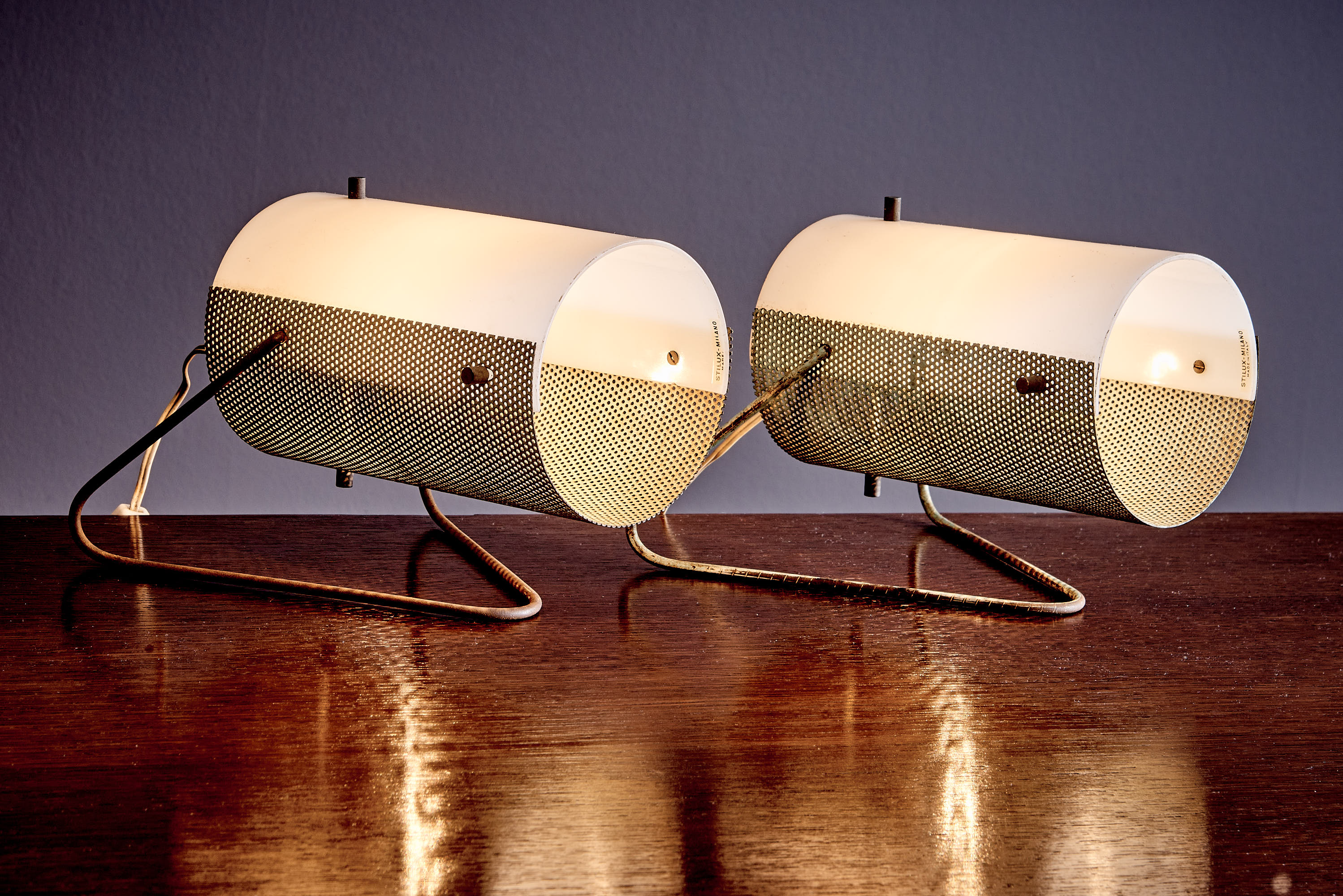 A pair of mid-century table lamps by Stilux Milano, each with a cylindrical shade made from perforated metal and a smooth white top diffuser. The shades can be used upright or laid on their side, creating soft, directional light.