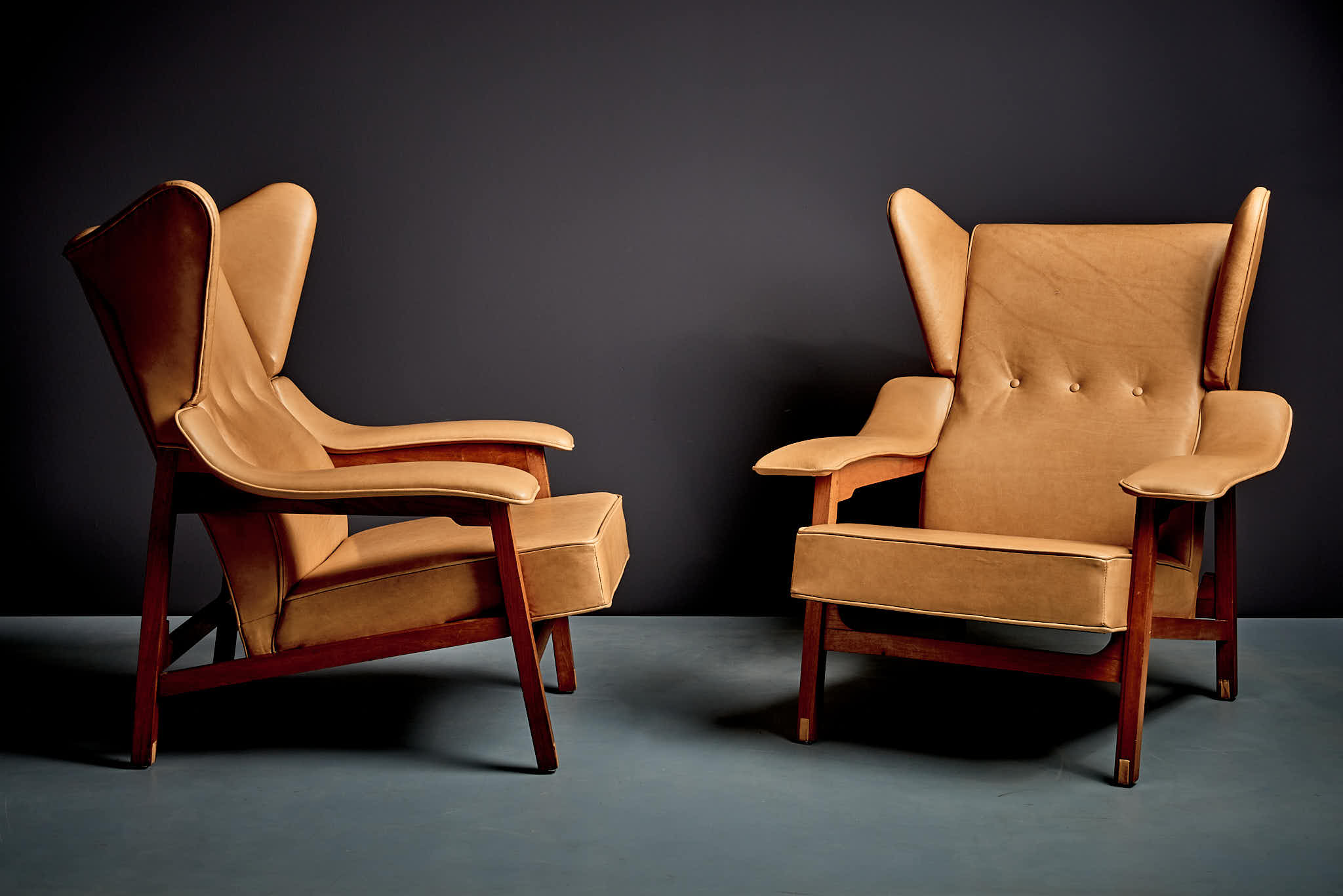 Pair of lounge chairs with angular walnut frames and winged backs. The chairs are defined by their deeply pitched seats, broad padded arms, and tailored leather surfaces, finished with piping that sharpens the profile of each element and clarifies the relationship between frame and upholstery.