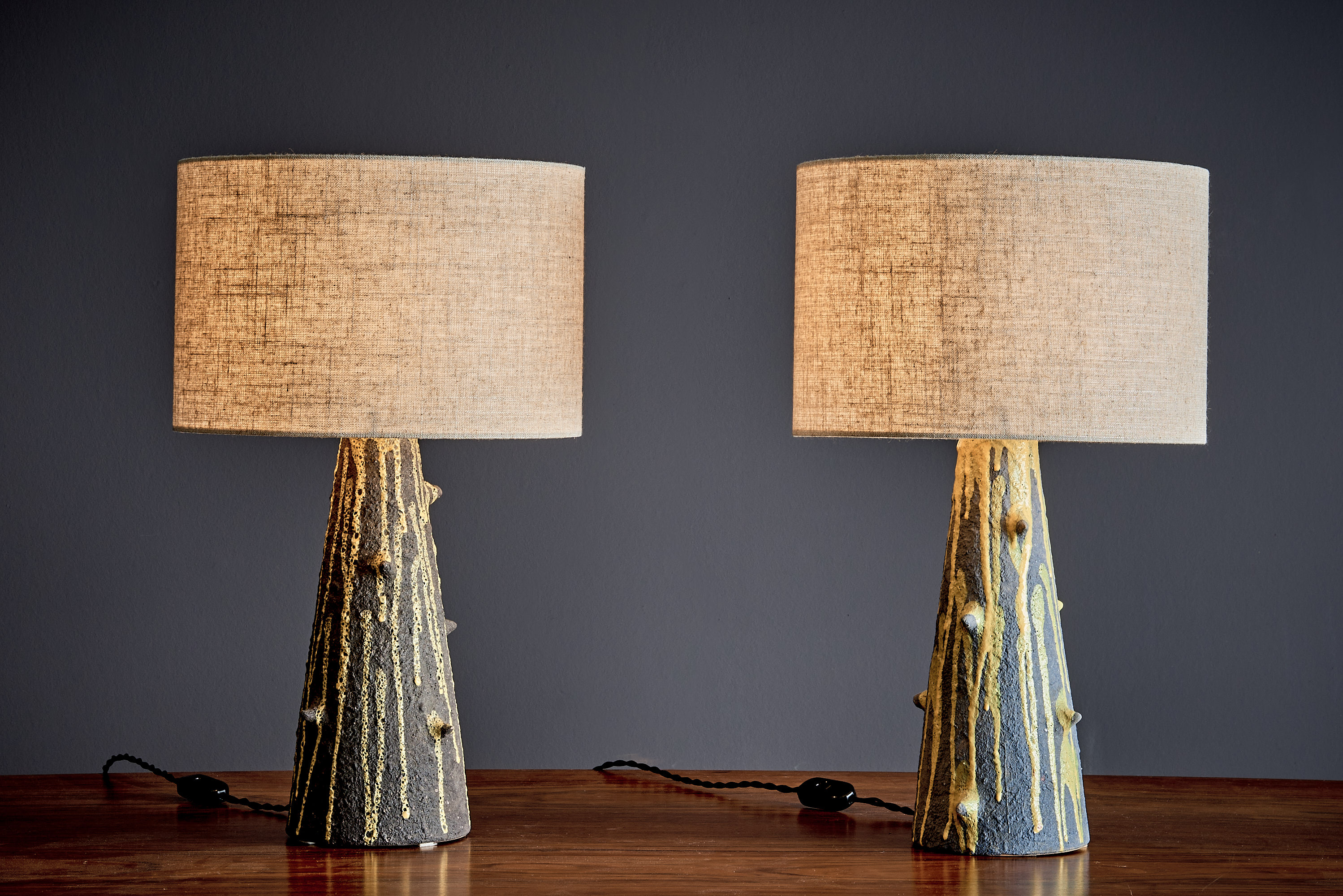 This pair of Bitossi table lamps brings the language of Italian studio ceramics into the domestic interior with an unmistakably sculptural presence. Each lamp is formed as a tall, tapering cone—almost totemic in silhouette—finished in a dark, volcanic-textured glaze that reads as both mineral and handmade. Vertical trails of pale, cratered glaze run down the surface like controlled drips, catching light and emphasizing the clay body’s rough relief. Small protruding nodes interrupt the smooth geometry, giving the forms a tactile, organism-like rhythm. Seen together, the lamps function as a composed set: closely related in scale and profile, yet individually animated by glaze flow and surface variation. Vintage condition with wear consistent with age and use; minor marks and irregularities to the ceramic and glaze inherent to the production. A second pair in the same form and dimensions is available in a darker glaze; see separate listing. Shades are shown for presentation. If you’re interested in a specific shade or would like something similar, feel free to contact us and we’ll be happy to make you an offer. The height was measured from the bottom edge to the top of the lamp socket.