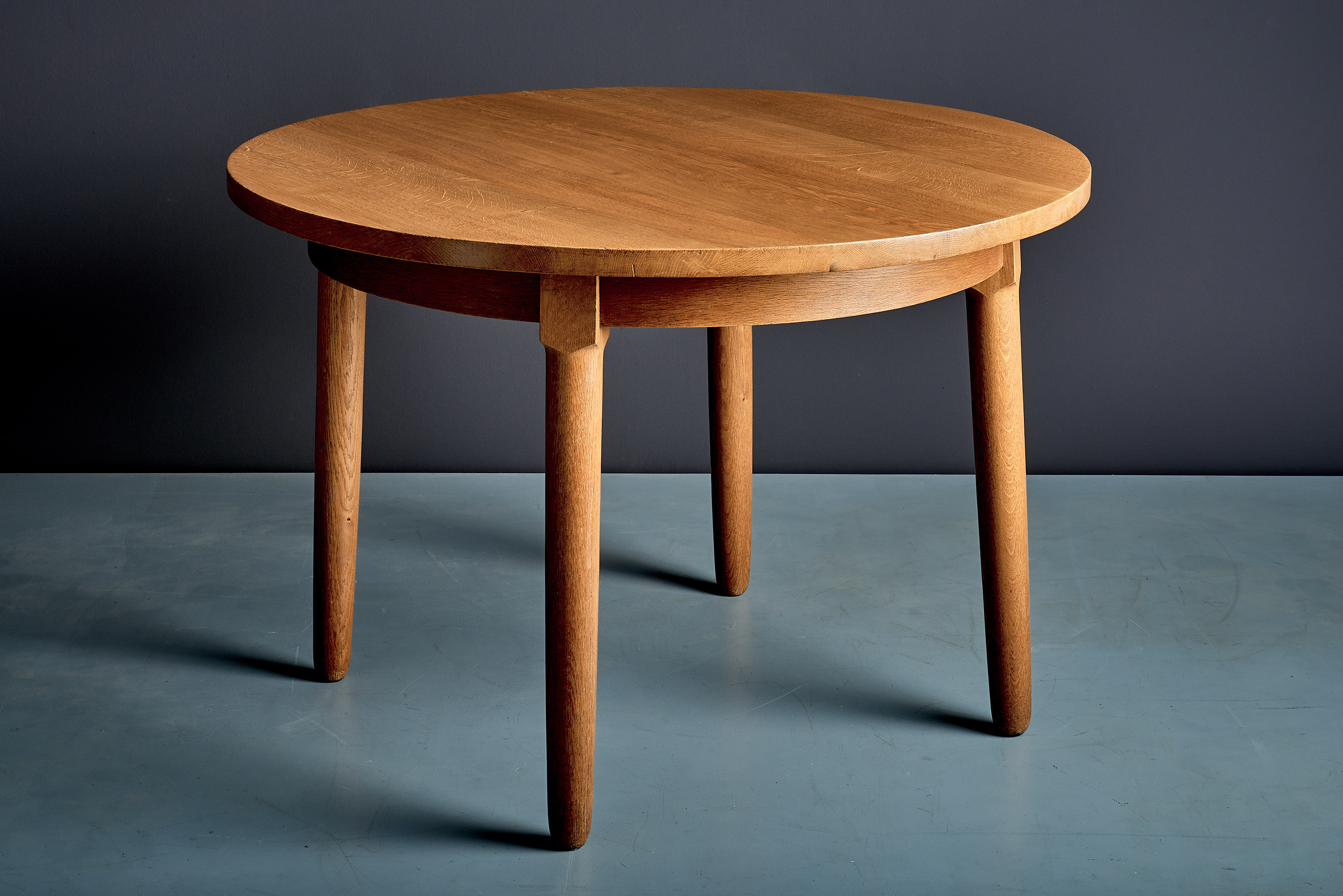 Round dining table in solid oak, finished in a warm, honey tone. The thick circular top sits on a simple apron with four tapered legs and discreet cross-bracing beneath—clean, honest joinery and balanced proportions that nod to the Hans Wegner school of Scandinavian modern. Light marks and patina consistent with age and use.