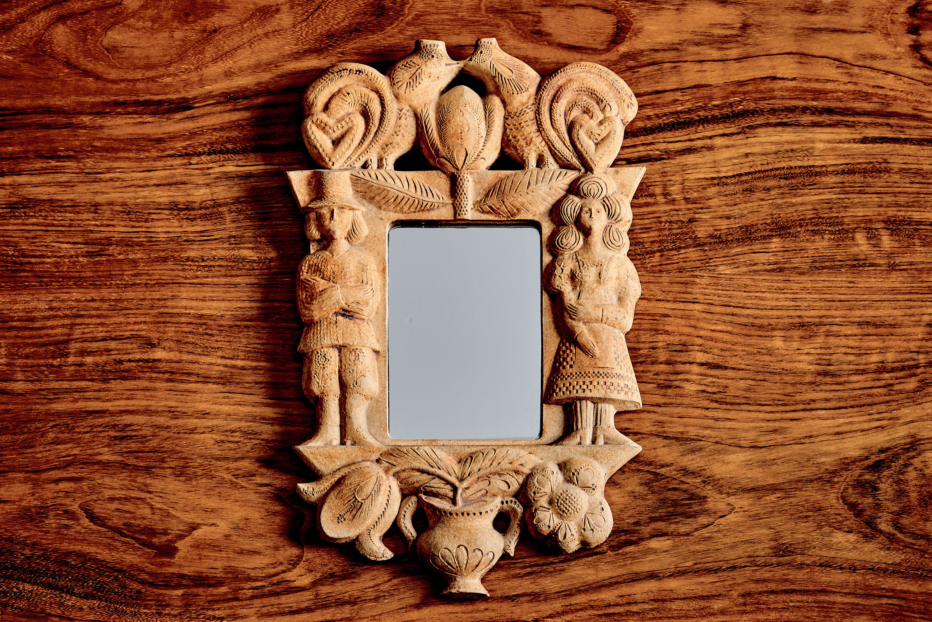 Decorative ceramic mirror by Roger Capron, featuring a sculpted frame with a folkloric couple, birds, and floral motifs. The textured stoneware and detailed relief work showcase Capron’s distinctive craftsmanship. Signed R. Capron on the back, this piece reflects the artist’s mid-century Vallauris production.