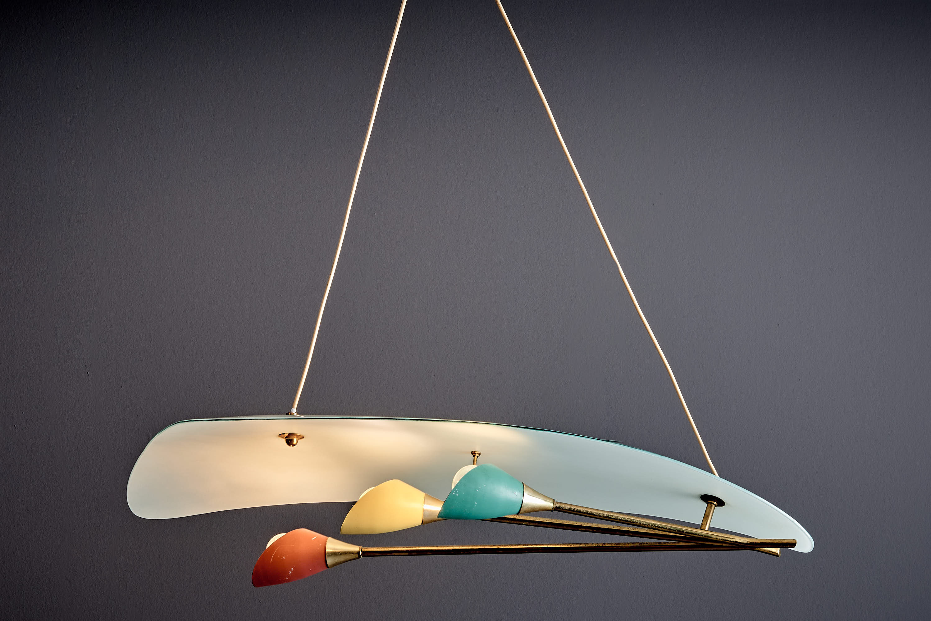 A sculptural 1950s Italian pendant with a sweeping frosted glass shade, brass structure, and three playful colored reflectors. Its asymmetrical form captures the elegance and optimism of postwar Italian design.