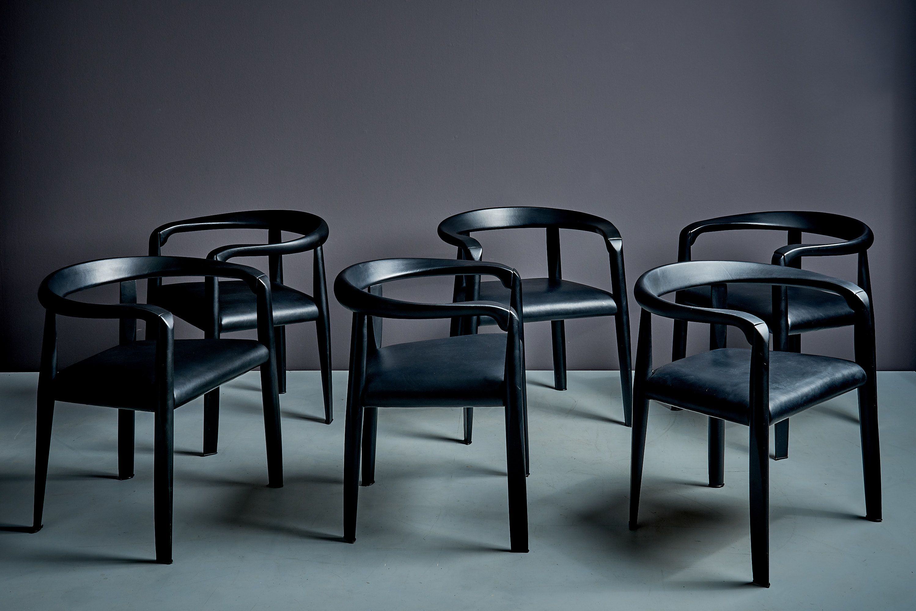 This set of six chairs, is the version with black leather upholstery to the seat and armrests, paired with frames in black-stained ash.