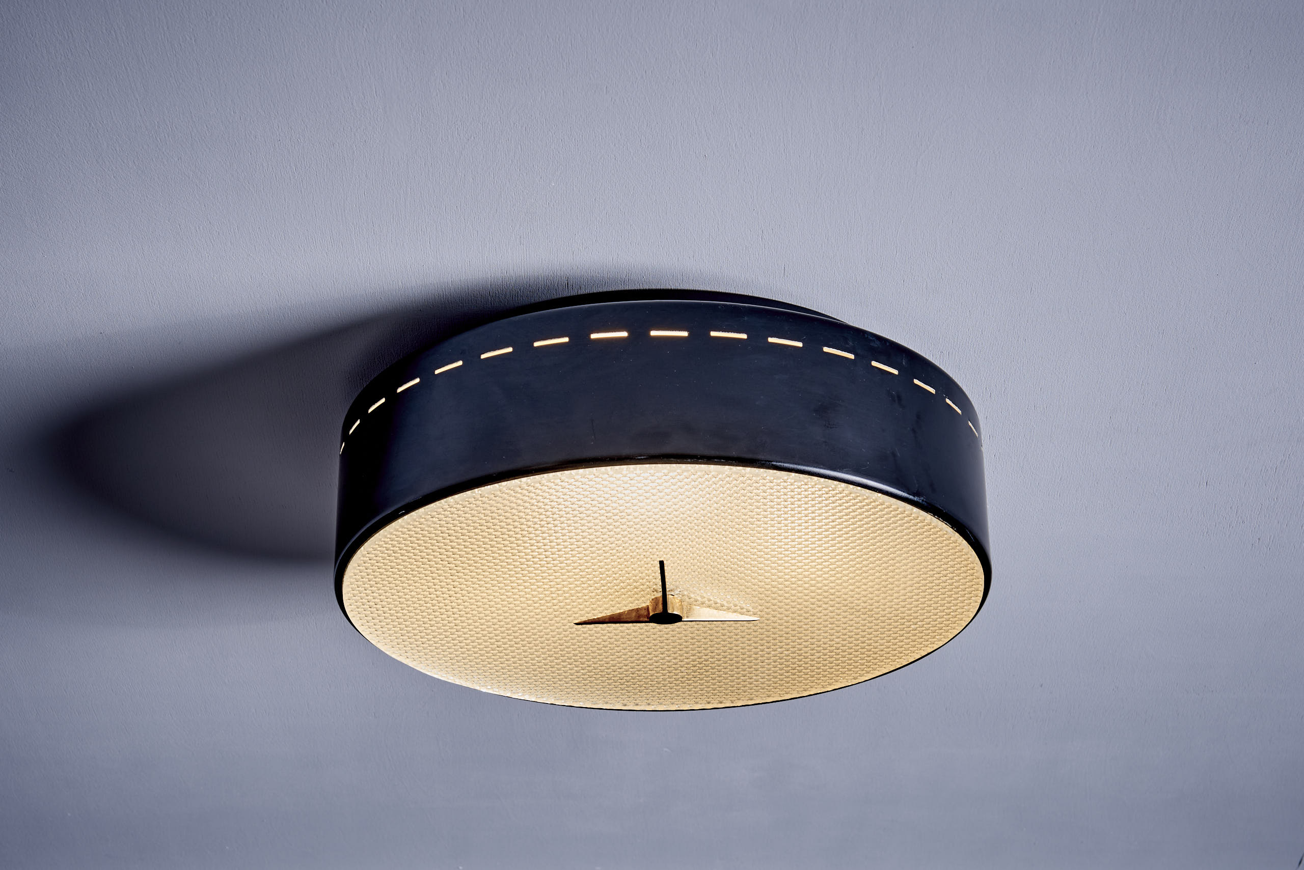 A rare mid-century flush mount ceiling light by Stilnovo. This striking piece features a black metal frame with a circular pattern of perforations emitting ambient side light. The textured glass diffuser casts a soft, warm glow while concealing three interior bulbs. The brass finial adds a refined detail to the center. Embossed with the Stilnovo mark. Vintage condition with minor wear consistent with age.