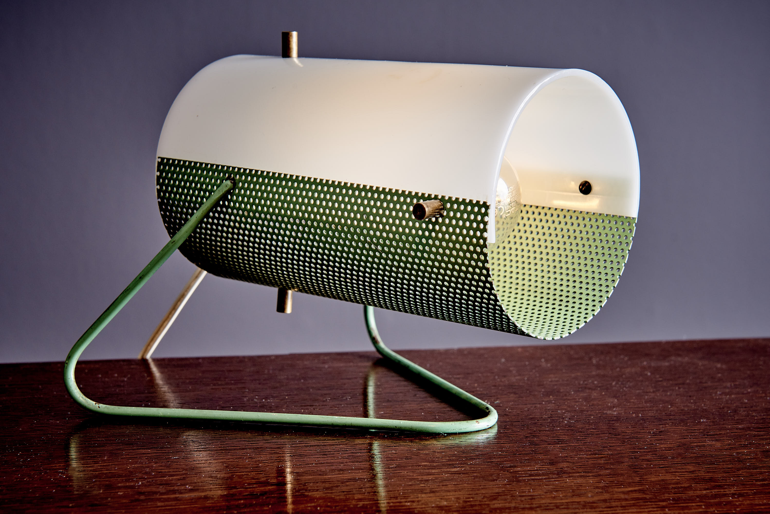 Mid-century table lamp by Stilux Milano, with a cylindrical shade made from perforated metal and a smooth white top diffuser. The shade can be used upright or laid on their side, creating soft, directional light.