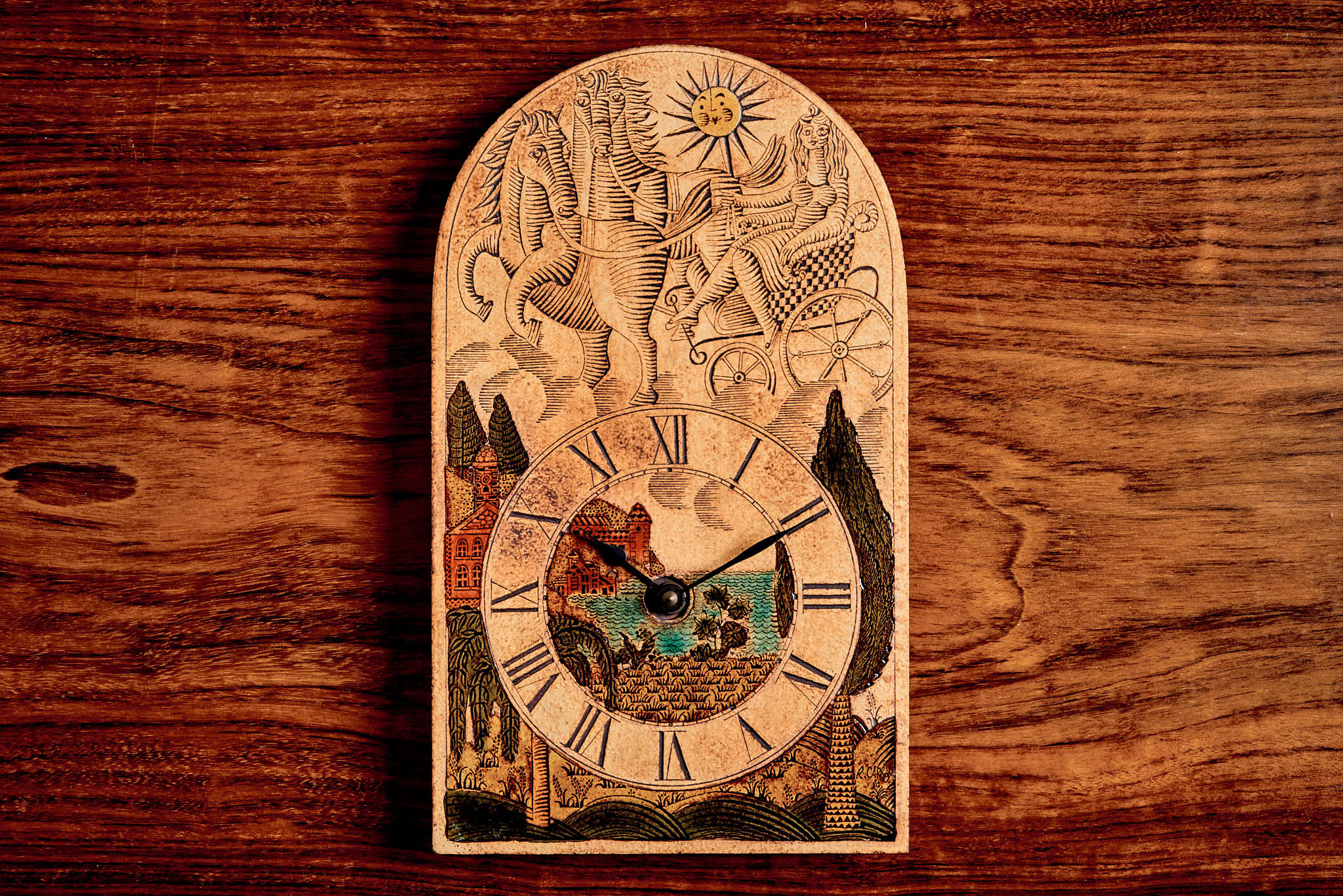 This sculptural wall clock was designed by Roger Capron himself and produced in his Vallauris workshop. Made from textured ceramic, it features Capron’s distinctive engraved decoration with a poetic, almost medieval narrative quality: a female figure riding a chariot drawn by stylized horses beneath a smiling sun, framed by architectural and landscape motifs. The arched form, Roman numerals, and finely incised line work are characteristic of Capron’s personal graphic language, blending rustic craftsmanship with modernist fantasy. Subtle hand-applied coloration enhances the engraved details while preserving the natural tone of the ceramic body. The clock retains its original clock movement, which has been tested and keeps accurate time.