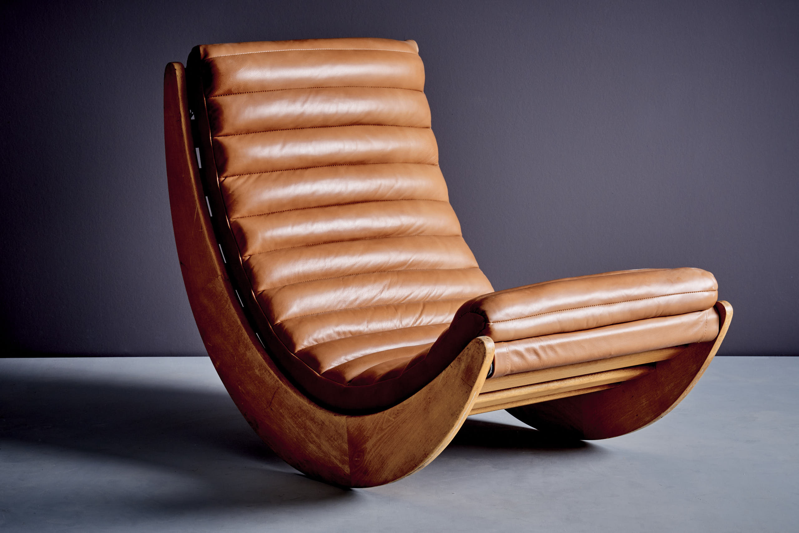 Verner Panton "Relaxer II" rocking chair, designed for Rosenthal Einrichtung, Germany, 1974. Reupholstered in brown leather. The beech frame shows light wear consistent with age. Dimensions: A true design classic and striking statement piece for any mid-century interior.