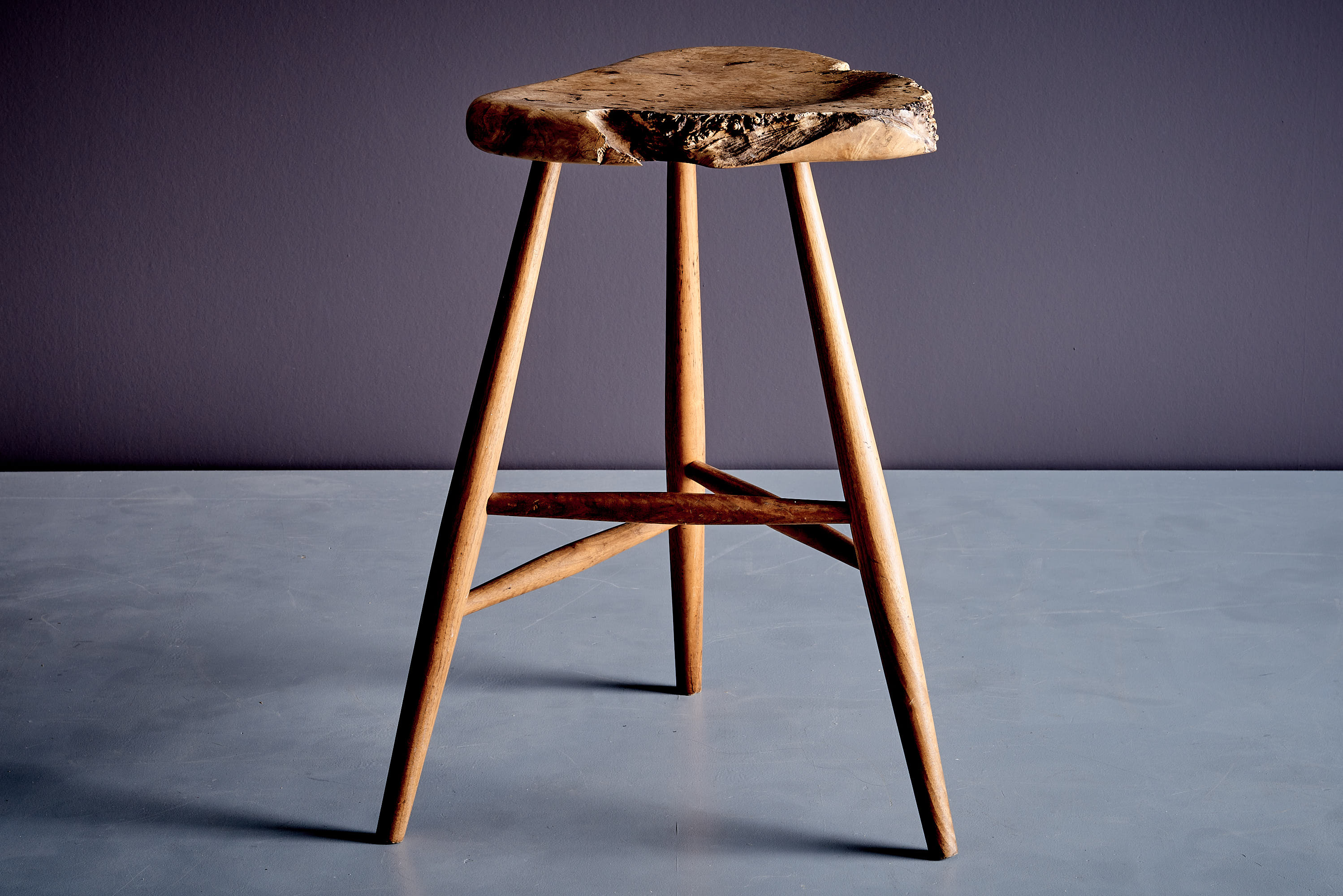 Set on three slender, tapered walnut legs joined by simple cross stretchers, the stool balances delicacy with strength. The smooth geometry of the base contrasts with the organic top, creating a visual dialogue between control and chance. Signed and dated on its underside, the piece reflects Elkan’s enduring philosophy: that design should honor the raw integrity of its materials while revealing the maker’s hand in every curve and joint.