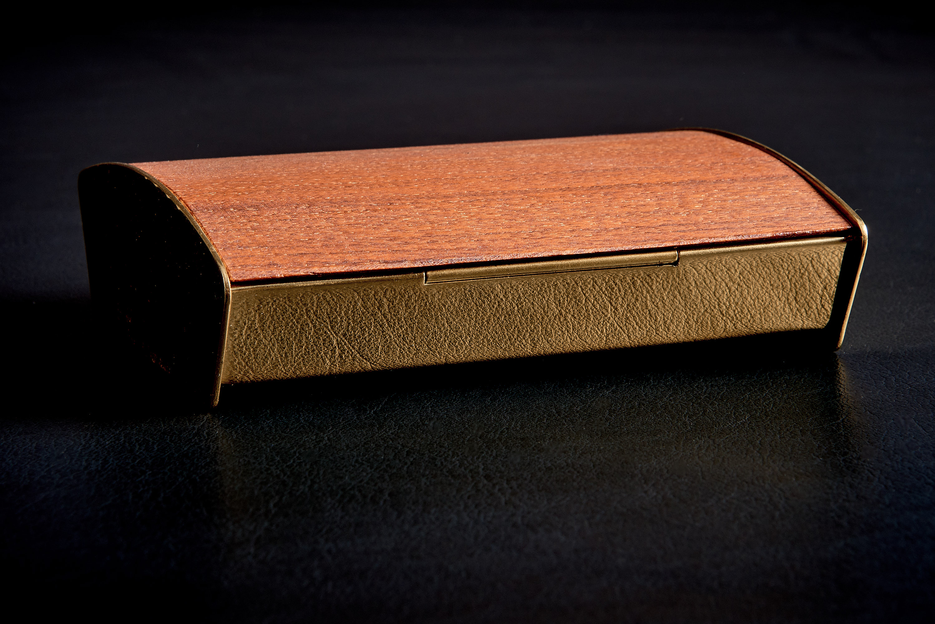 Small box by Werkstätten Carl Auböck with curved wooden lid and brass body, lined with cork inside. The design combines a warm wood surface with brushed brass sides, creating the characteristic contrast of natural material and metal typical of the Auböck workshop.
