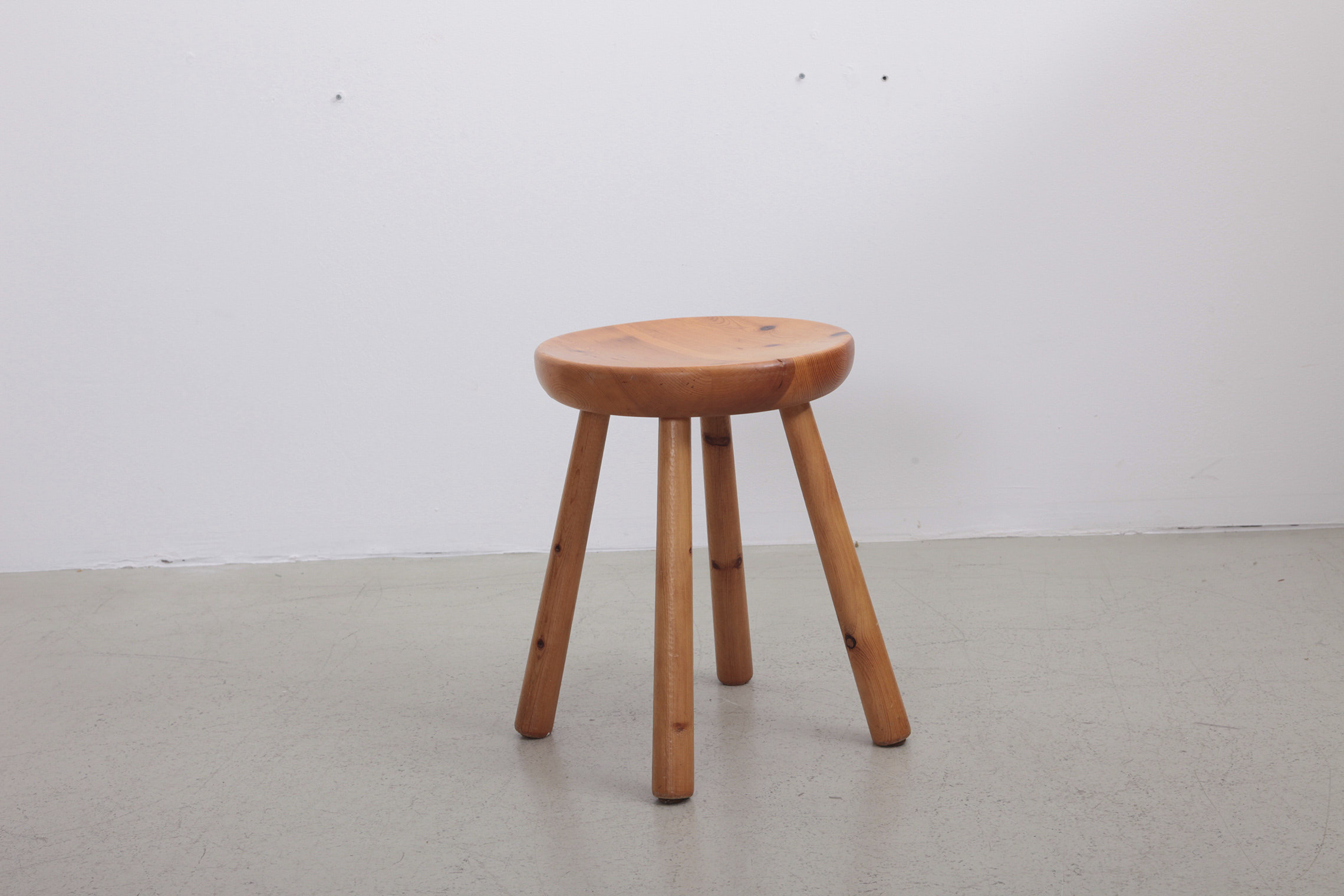Strong solid pine Perriand stool in a very good condition. Provenance is Alpine Station des Arcs, Savoie, France, circa 1965.