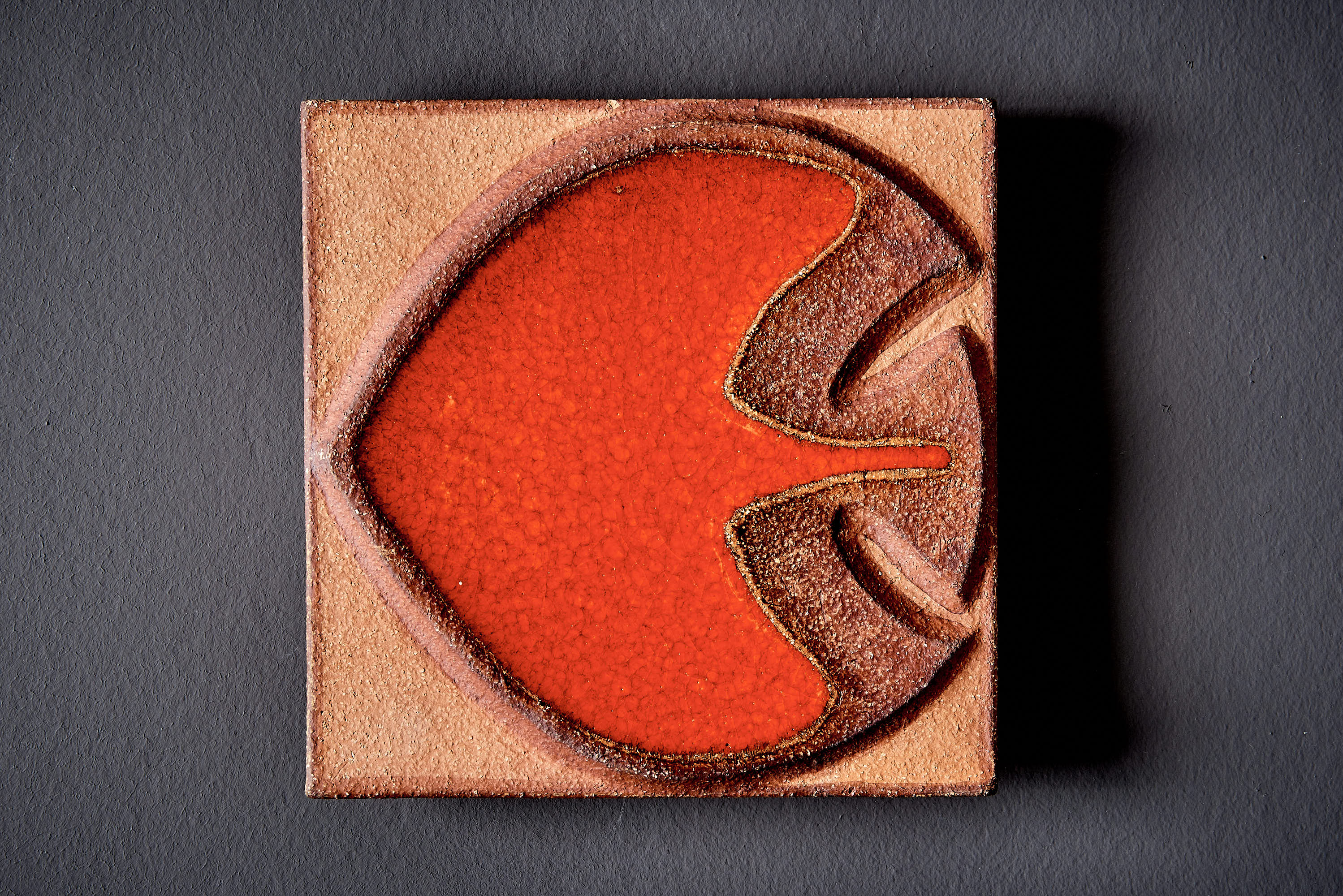 Decorative ceramic wall tile by Søholm, with a raised fish motif in warm orange and brown glazes. The piece has a textured surface with a strong crackled glaze and a beautiful handmade quality.