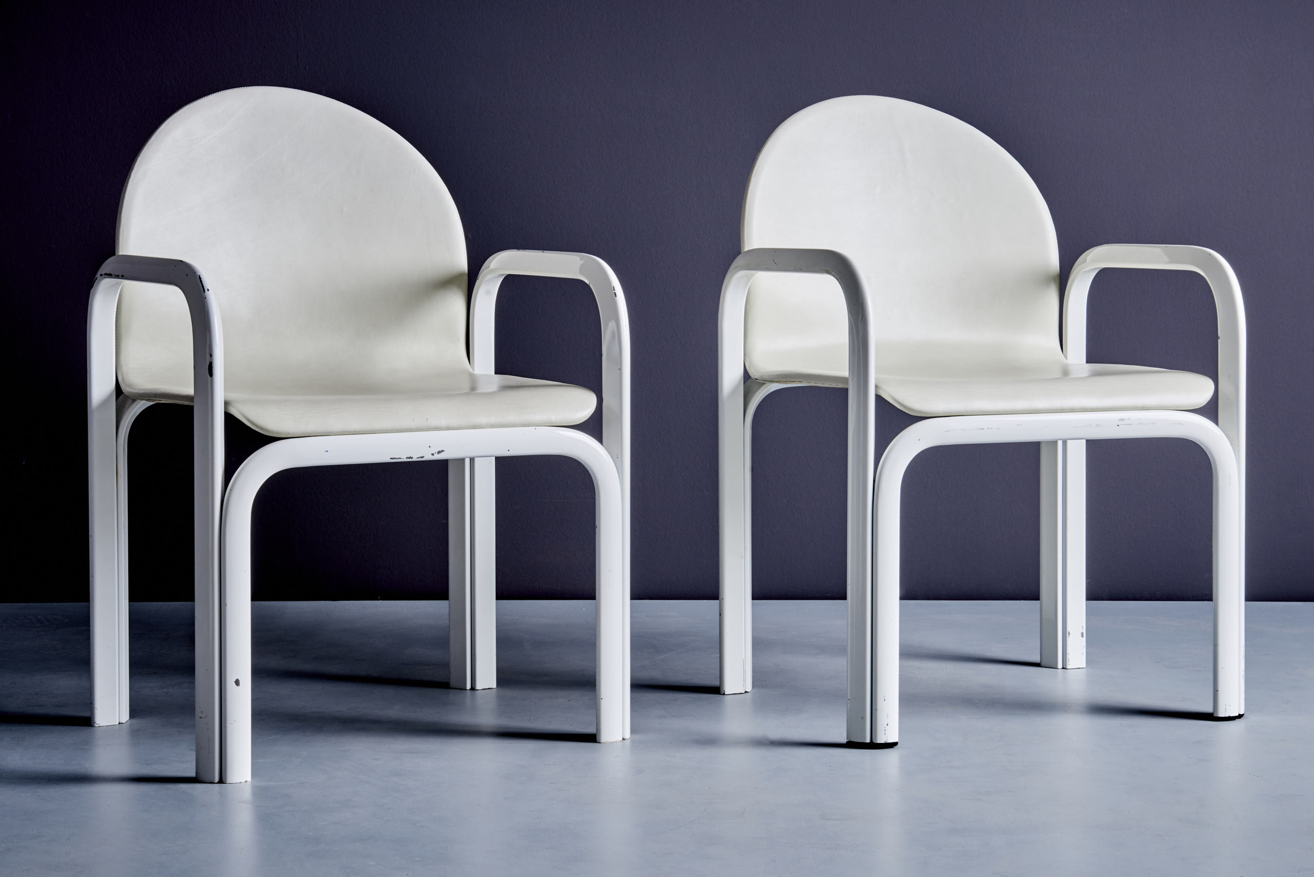Pair of Orsay armchairs by Gae Aulenti for Knoll, 1975. Made of white leather and lacquered steel, these chairs feature a bold, curved design. They remain in their original vintage condition with visible signs of use, adding to their authentic charm.