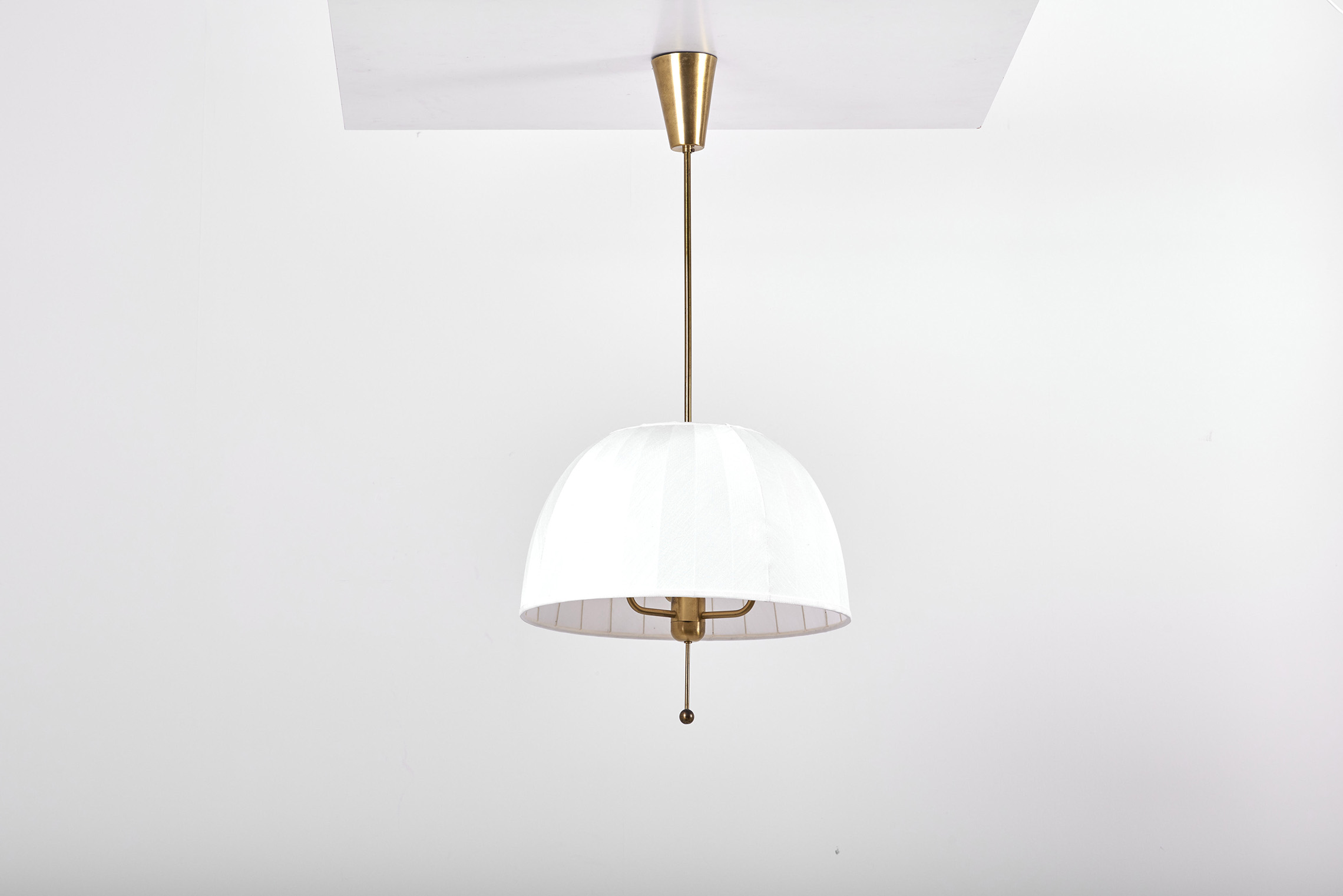 Pendant lamp, model T549, in brass designed by Hans-Agne Jakobsson in 1960s and manufactured by AB Markaryd in Sweden. The fabric of the lamp shade in off-white chintz is new.