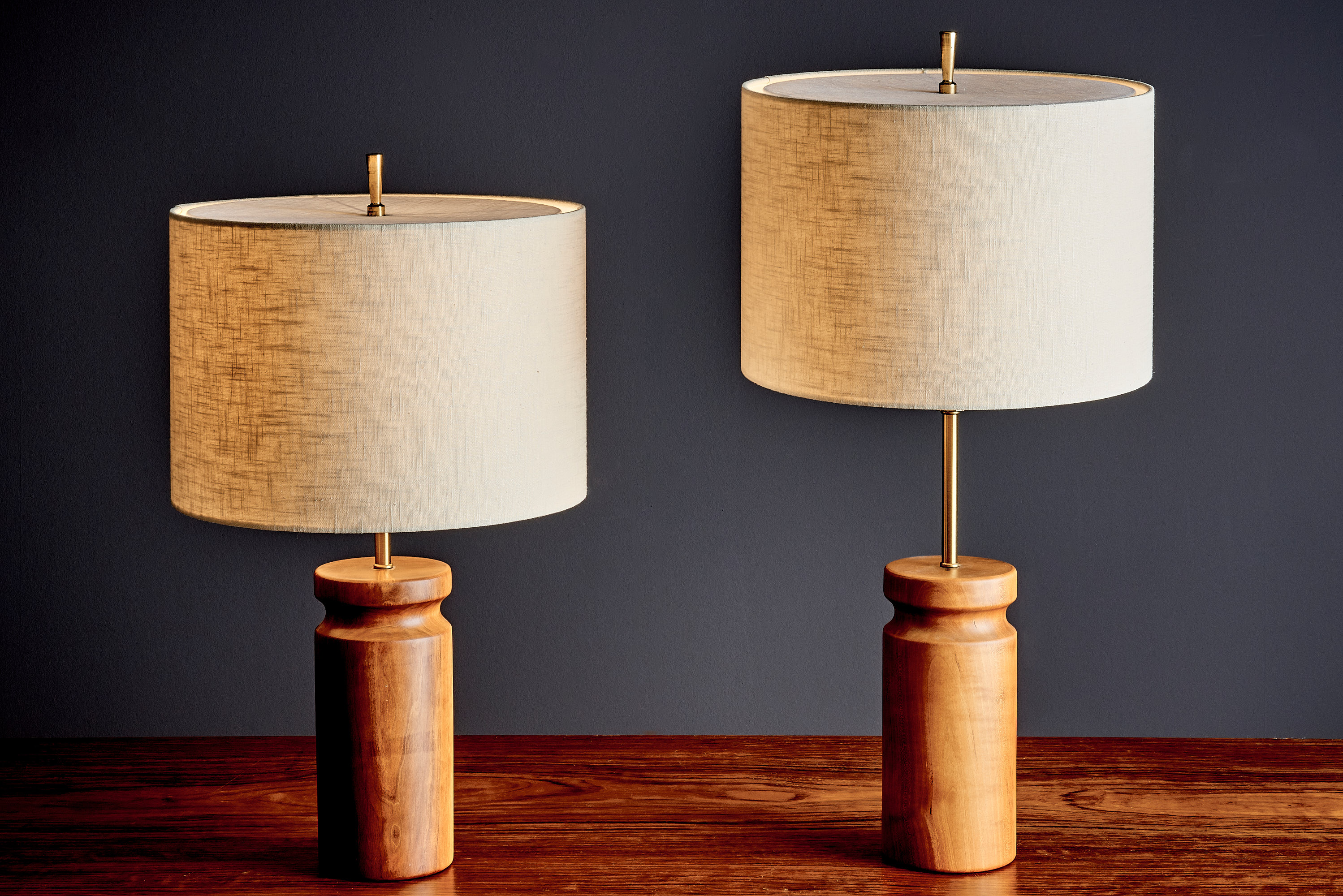 Designed by Arden Riddle in the 1960s, this pair of table lamps reflects a restrained mid-century vocabulary through turned solid cherry wood bases and balanced proportions. The sculptural silhouettes emphasize material presence, with warm grain variation in the wood set against understated brass elements. The height to the top edge of the lamp socket is 38cm /43cm.