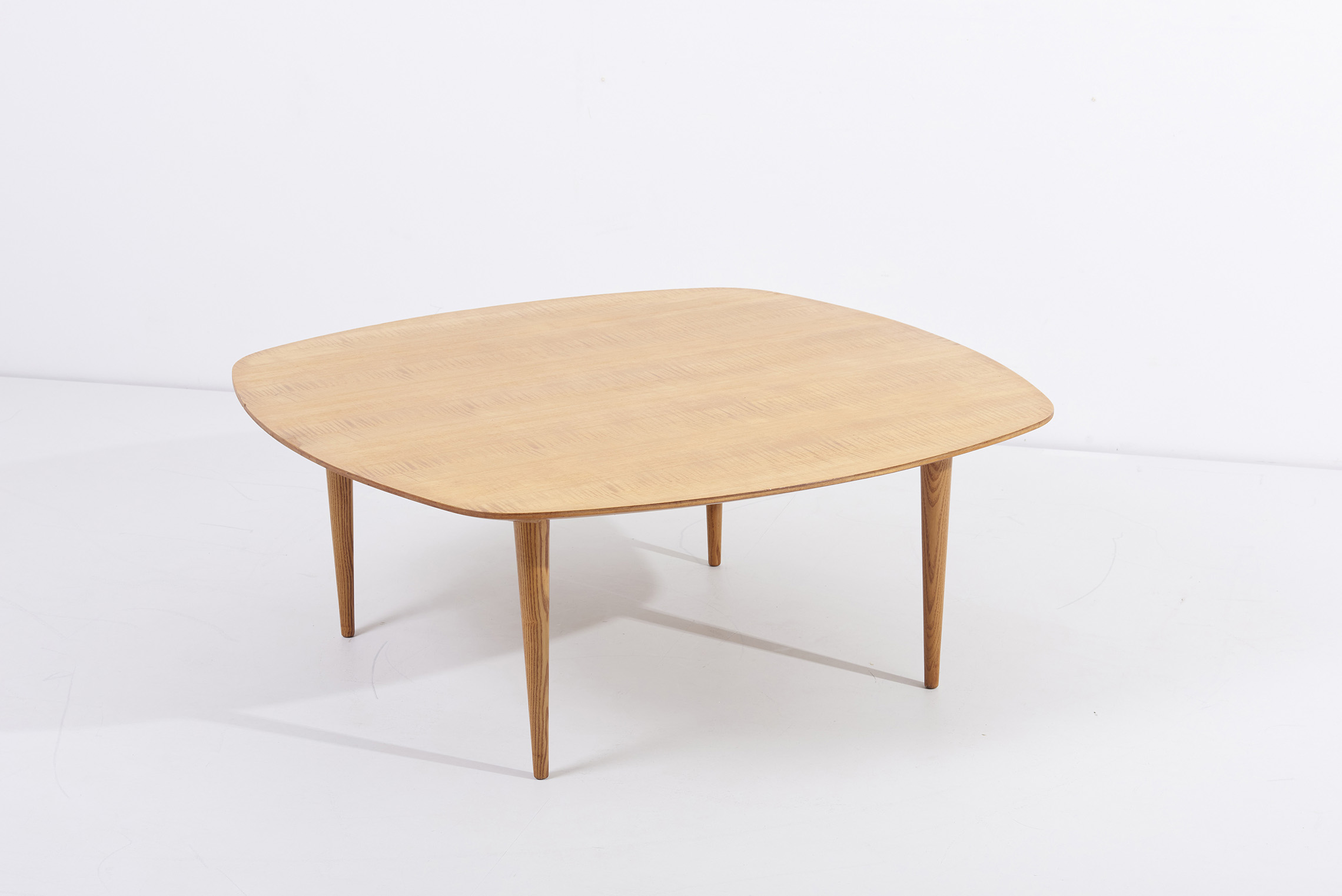 This elegant coffee table by André Simard reflects the refined craftsmanship and organic modernism of postwar French design. The subtly curved, almost square top reveals the striking natural figure of the ash veneer, supported by tapered legs in solid beech. The piece exemplifies Simard’s pursuit of warmth and simplicity within a modern aesthetic. This table by André Simard is in good vintage condition and still has the original label.